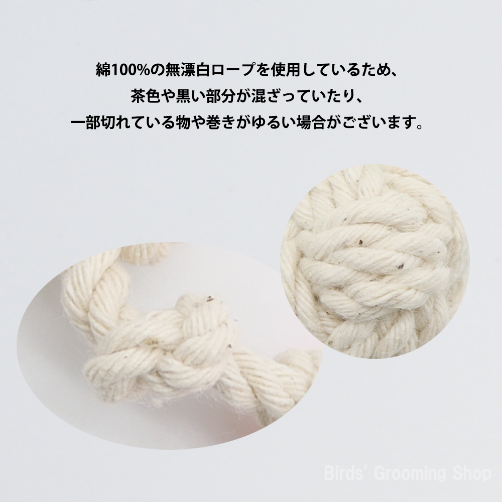 - 綿100%の無漂白ロープを使用しているため、茶色や黒い部分が混ざっていたり、一部切れている物や巻きがゆるい場合がございます。