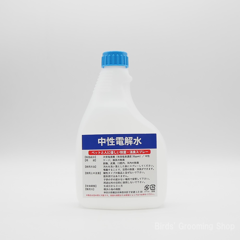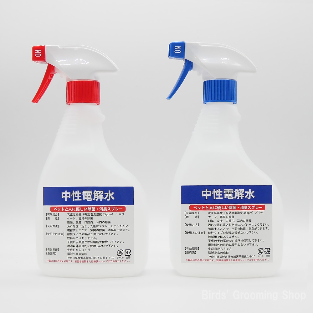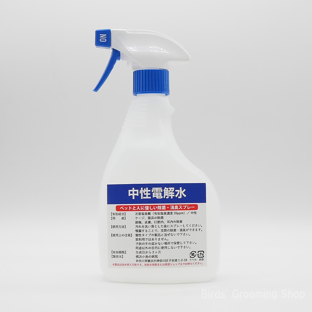 ケージや器具の除菌や創傷、皮膚、口腔内、耳内の除菌に使用できます。また、アスペルギルス症の予防に効果的です。 ※現在院内は全て中性電解水で除菌を行っております。PBFDウイルスにもお使い頂けます。