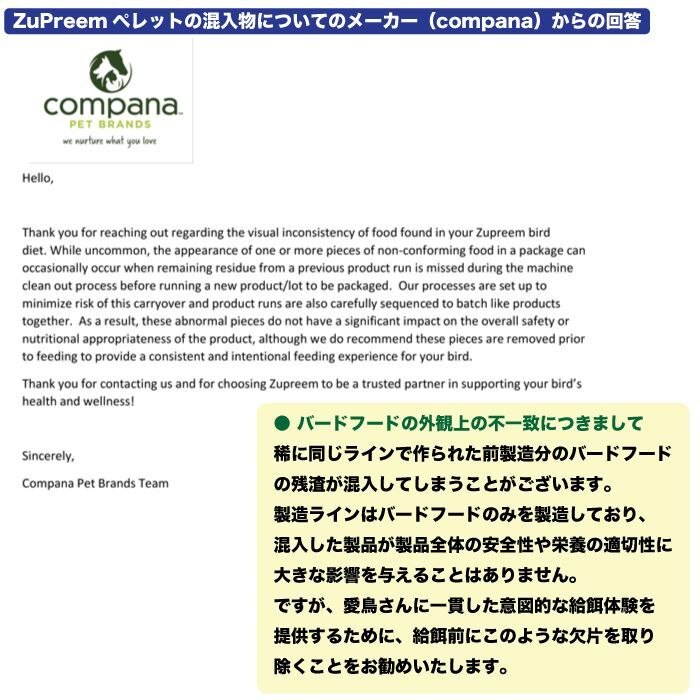 - フルーツブレンドに使用されている着色料は有機物質で、鳥類の体内には吸収されず糞と共に排出される安全性が高いものとなっております。